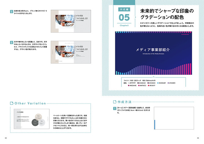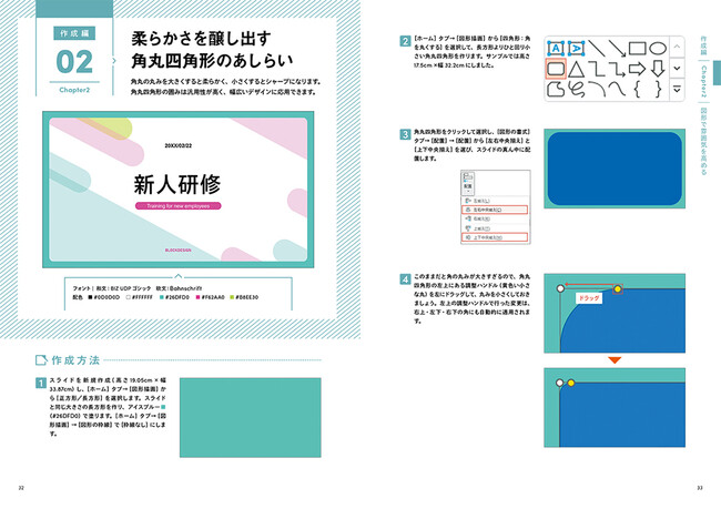 本書では、パワポでスライドを作成するときの手順を、そのまま再現できる構成にしています。