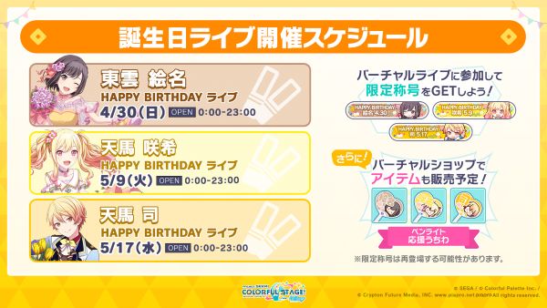東雲絵名、天馬咲希、天馬司の誕生日を記念して、バーチャルライブの開催が決定いたしました。バーチャルショップにてアイテムペンライト「応援うちわ」を販売予定です。今回も誕生日にあわせて「HAPPY BIRTHDAYガチャ」を開催いたします。