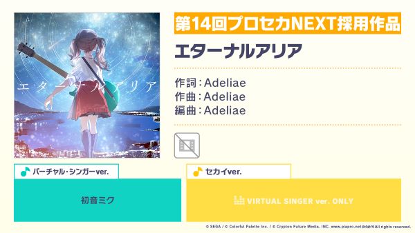 新たなリズムゲーム楽曲として、「エターナルアリア」(作詞・作曲:Adeliae)の追加が決定いたしました。本楽曲は、「一緒に作ろう!第14回楽曲コンテストプロセカNEXT」の採用楽曲です。