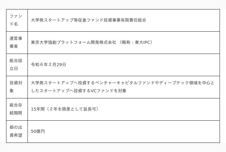この度、令和6年2月29日付で運営事業者である東京大学協創プラットフォーム開発株式会社との間でファンド契約を締結、同年3月に都からの出資を完了し、ファンドとしての活動を開始しましたので、お知らせいたします。