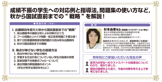講師は、国家試験のエキスパートとして基礎教育にも精通されている杉本由香先生が登壇!学生を合格へと導く指導方法を解説いたします。