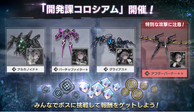“開発課コロシアム”では、他の開発課と競い合いながら、期間中に登場する4体のボスに挑戦する期間限定イベントです。4体のボスは属性や有効な攻撃が異なるため、同じ開発課内での情報交換や所持キャストに合わせた役割分担がより上位を目指す鍵となります。