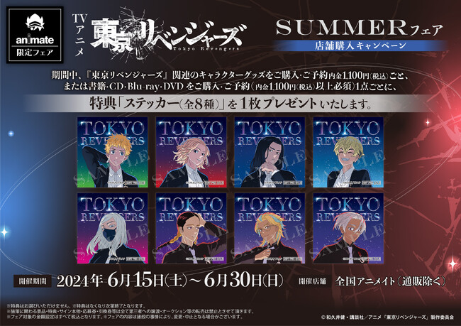 更に!更に!6月15日〜6月30日には全国のアニメイトにて「TVアニメ『東京リベンジャーズ』SUMMERフェア 店舗購入キャンペーン」を開催!こちらの特典は「ステッカー(全8種)」となります。