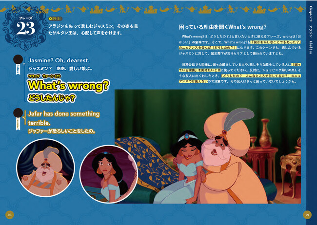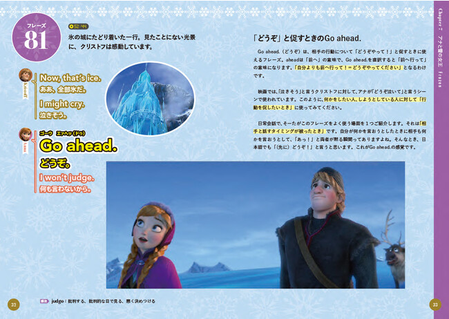 そこで、本書は大人気ディズニー映画に出てきたフレーズの中から、日常会話で本当に使う表現だけを「122フレーズ」に厳選。本書の中にはたくさんの場面写真が収録されているので、映画を見ている気分で、映画のストーリーや場面とともに、英会話フレーズを楽しく身につけることができます。登場人物になりきって、声に出してフレーズを言ってみましょう!