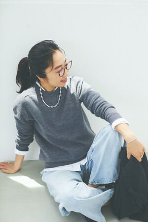 ふっくらとした肉厚な生地、肩のラインのないセミラグランスリーブで、インにシャツをレイヤードしてもゴワゴワしたりもたつくことなく綺麗に決まります。一枚でシンプルに着るのはもちろん、ニットの袖や裾から白シャツを覗かせたレイヤードスタイルもおすすめ。スエット感覚でスポーティにデニムと合わせても、エレガントなスカートスタイルにも、センタープレスパンツと合わせた端正な着こなしにも難なくマッチするミモレ別注ダブルフェイスニット。クローゼットの定番として何年も愛せる上質な一枚です。