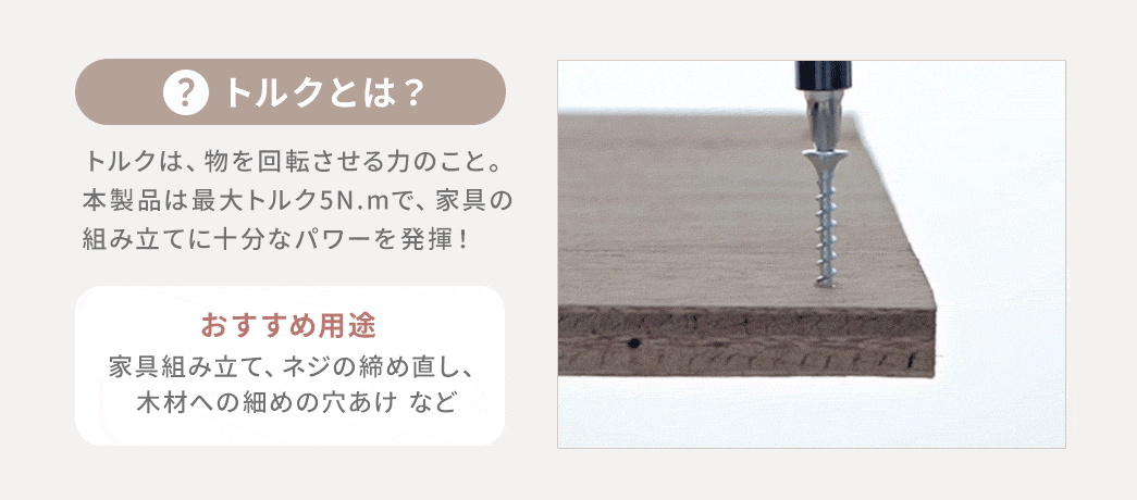 ●ラクラク家具を組み立てられる5N.mのトルク(締める力)です。