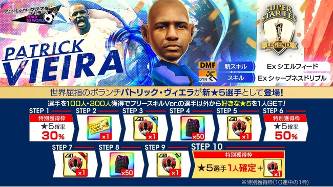 レジェンド「パトリック・ヴィエラ」をはじめとした、フランスのスーパースターたちが新★5選手として登場する特典付きの特別なスカウトです。