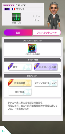 該当の選手を編成すると強くなるフォーメーションコンボ「トリコロールの雄姿」と、「戦術得意度Lv9」を持つ新★6監督「ドミレク」が登場! 期間中に開催される特別ミッション「10試合行う」で獲得できます。