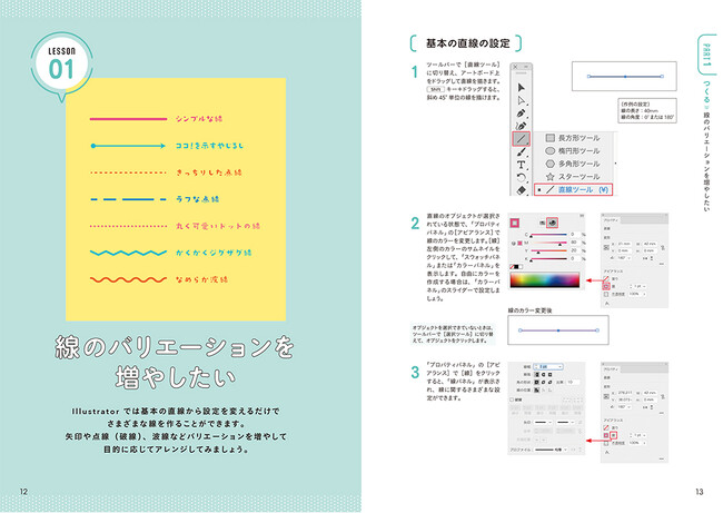 まだIllustratorの操作には慣れていなくても、作りたいものはたくさんある! そんな方に活用してもらいやすいよう、ベーシックな技法を中心に、より簡単な操作で辿り着けるように解説をしています。