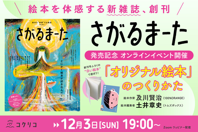 「さがるまーた」発売を記念して、ふろくの「?い絵本」を使った、「絵本のつくりかた」をお話しするオンラインイベントも開催します。 教えてくれるのは、今回「さがるまーた」に「白い絵本」と同じサイズの別冊ふろく絵本『おはよう』を寄稿してくれた100%ORANGEの及川賢治さんと、絵本編集者のトムズボックス・土井章史さん。 アイディアの出し方、ラフの描き方、表紙の考え方など、プロならではの創作方法は、絵本作家を目指している方にとっても役立つ内容になるはずです。 「絵本づくり」が初めて、という方でも大丈夫! 世界で一冊の、あなただけの絵本をいっしょに作りましょう。お申し込みをお待ちしております。