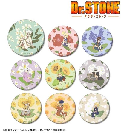 石神千空、コハク、クロム、あさぎりゲン、スイカ、氷月、西園寺羽京、七海龍水、フランソワのイラストをボタニカルデザインに落とし込んで繊細なタッチで新たに描き起こし、マットな手触りの缶バッジに仕上げました。