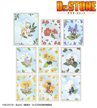 石神千空、コハク、クロム、あさぎりゲン、スイカ、氷月、西園寺羽京、七海龍水、フランソワのイラストをボタニカルデザインに落とし込んで繊細なタッチで新たに描き起こし、アクリルカードに仕上げました。