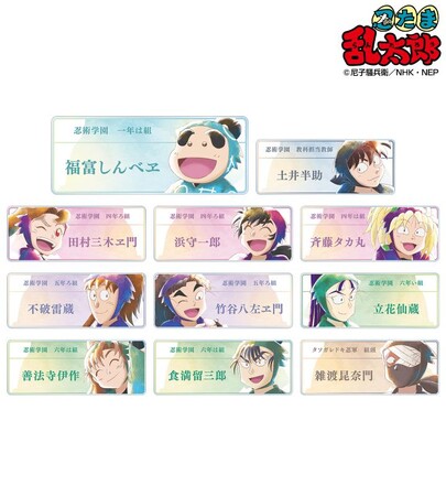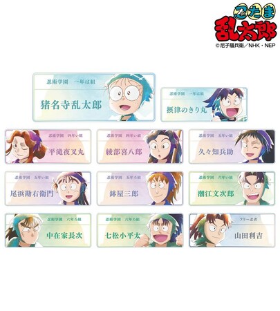 猪名寺乱太郎、摂津のきり丸、平滝夜叉丸、綾部喜八郎、久々知兵助、尾浜勘右衛門、鉢屋三郎、潮江文次郎、中在家長次、七松小平太、山田利吉を新たなタッチで魅力的に表現し、アクリルネームプレートに仕上げました。