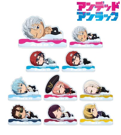 アンディ、出雲風子、シェン、ジーナ、ジュイス、ビリー、ムイ、リップがころんと寝ているちびキャラを新たに描き起こし、アクリルスタンドに仕上げました。