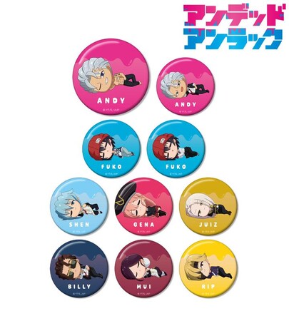 アンディ、出雲風子、シェン、ジーナ、ジュイス、ビリー、ムイ、リップがころんと寝ているちびキャラを新たに描き起こし、缶バッジに仕上げました。