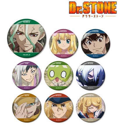 石神千空、コハク、クロム、あさぎりゲン、スイカ、氷月、西園寺羽京、七海龍水、フランソワの印象的なシーンを缶バッジに仕上げました。