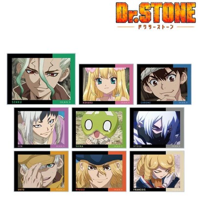 石神千空、コハク、クロム、あさぎりゲン、スイカ、氷月、西園寺羽京、七海龍水、フランソワの印象的なシーンをアクリルカードに仕上げました。