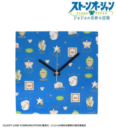 空条徐倫、E・コステロ、フー・F、E・アルニーニョ、ウェザー・R、ナルシソ・A、空条承太郎、G.D.st JAILの印象的なモチーフをシンボルマーク風にデザインし、ファブリックウォールクロックに仕上げました。