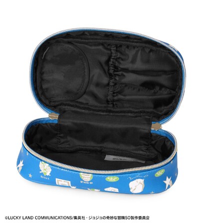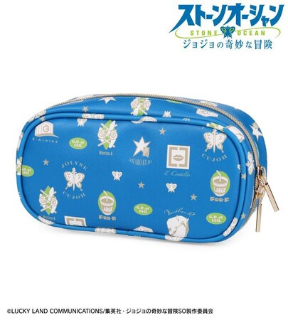 空条徐倫、E・コステロ、フー・F、E・アルニーニョ、ウェザー・R、ナルシソ・A、空条承太郎、G.D.st JAILの印象的なモチーフをシンボルマーク風にデザインし、メイクポーチに仕上げました。
