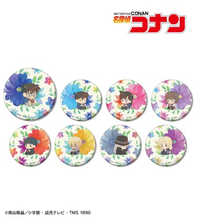 江戸川コナン、工藤新一、毛利蘭、灰原哀、赤井秀一、安室透、ジン、ベルモットのイラストをボタニカルデザインに落とし込んで繊細なタッチで新たに描き起こし、マットな手触りの缶バッジに仕上げました。