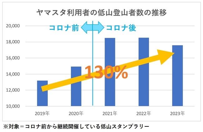 近年、手軽に楽しめるアウトドア・アクティビティとして、ますます人気が高まっている低山登山。ヤマスタ利用者の低山登山者数は、コロナ禍前に比べて130%(※ヤマスタ調べ)増加しています。