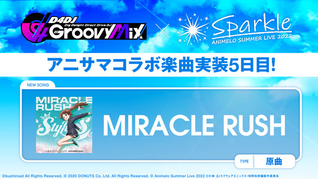 株式会社ブシロード(本社:東京都中野区、代表取締役社長:木谷高明)は、株式会社DONUTS(本社:東京都渋谷区、代表取締役:西村啓成)と共同開発のスマートフォン向けリズムゲーム「D4DJ Groovy Mix」(以下グルミク)にて、8月26日(金)、8月27日(土)、8月28日(日)に開催されたアニソンイベント 「Animelo Summer Live 2022 -Sparkle- (アニサマ)」とのコラボ楽曲として「MIRACLE RUSH」原曲を追加いたしました。他、アニサマコラボ楽曲実装の記念を記念してフォロー&RTキャンペーンの開催や今後のアニサマコラボ楽曲実装スケジュールをお知らせいたします。