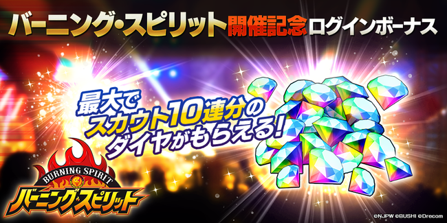 新日本プロレスのバーニングスピリット開催を記念して、最大1,500ダイヤ(10連スカウト1回分)が獲得できるログインボーナスを実施!