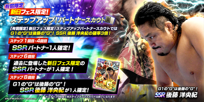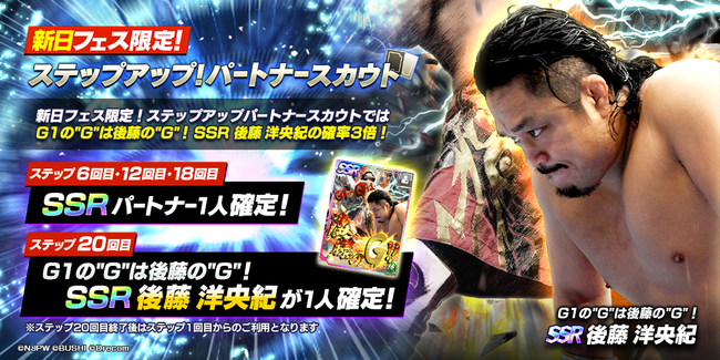 さらに、初登場となるフェス限定新SSRパートナー「[G1の”G”は後藤の”G”!]後藤洋央紀」は、ピックアップ対象パートナーとして、ステップアップ回数に関わらずスカウト確率が通常の3倍となっております。
