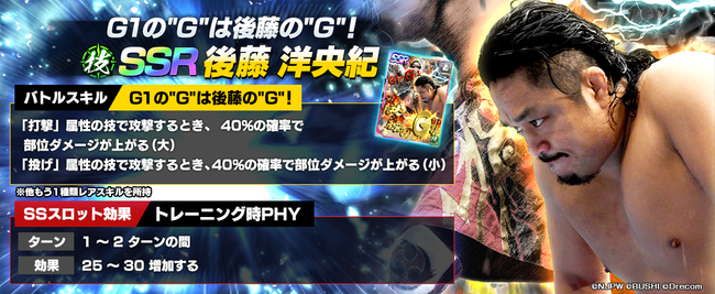 さらに同期間にて、試合中に相手の能力を継続的に下げられる強力なバトルスキルを持ったフェス限定新SSRパートナー「[G1の”G”は後藤の”G”!]後藤洋央紀」が初登場するフェス限定ステップアップパートナースカウトを開催中。