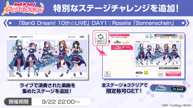 2022年9月22日(木)22時より、「BanG Dream! 10th☆LIVE」DAY1 : Roselia「Sonnenschein」の開催を記念し、スマートフォン向けゲーム「バンドリ! ガールズバンドパーティ!」内のステージチャレンジ「特別」に、本ライブで演奏された楽曲を集めたステージを追加いたします。