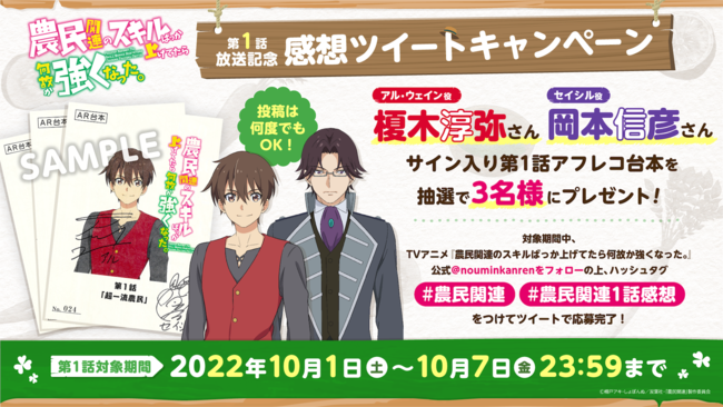 TVアニメ『農民関連のスキルばっか上げてたら何故か強くなった。』第1話放送を記念して、アル・ウェイン役 榎木淳弥さん、セイシル役 岡本信彦さんのサイン入り第1話台本を、3名様にプレゼント致します。