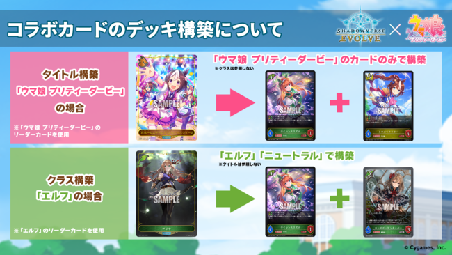 エルフなどの「クラス」での構築と、コラボスターターデッキ「出走!ウマ娘!」、コラボパック「ウマ娘 プリティーダービー」のカードのみ使用する「タイトル」での構築、どちらでも遊ぶことが可能となります。