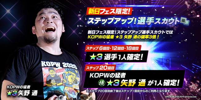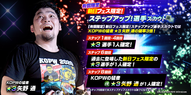 ステップアップ10連スカウトを6回行った際に、フェス限定★3選手の中のどれか1人が確定となり、8回目ではフェス限定新★3選手「[KOPWの猛者]矢野通」が1人確定となる有償ダイヤ限定ステップアップ選手スカウトとなります。