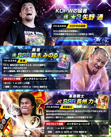 さらに、初登場のフェス限定新★3選手「[KOPWの猛者]矢野通」がピックアップ対象選手として、ステップアップ回数に関わらずスカウト確率が通常の3倍かつ獲得時のピース量が増量となっております。