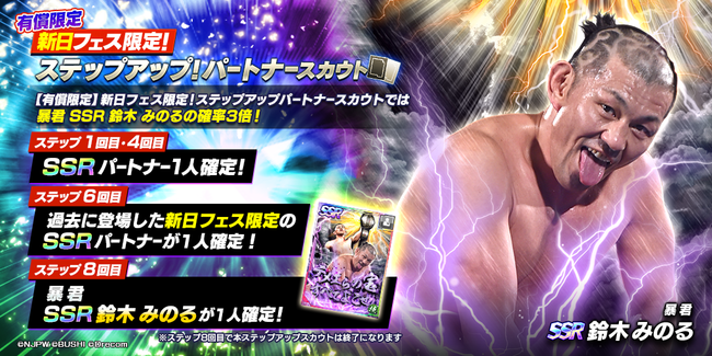 初登場となるフェス限定新SSRパートナー「[暴君]鈴木みのる」は、ピックアップ対象パートナーとして、ステップアップ回数に関わらずスカウト確率が通常の3倍となっております。