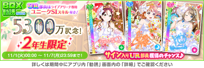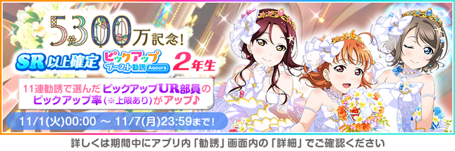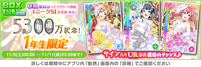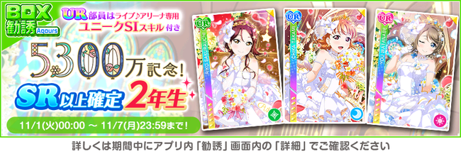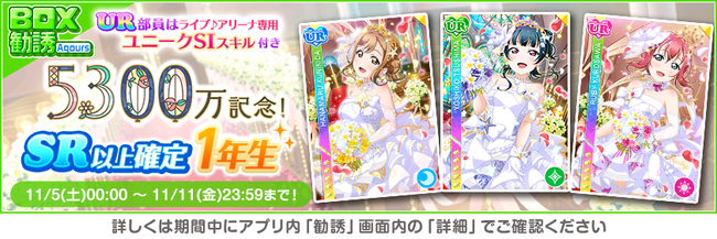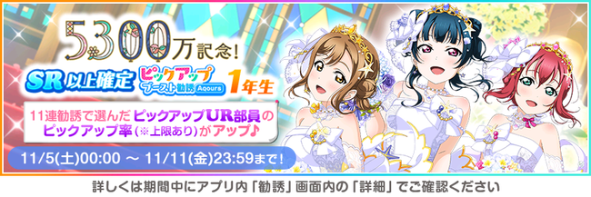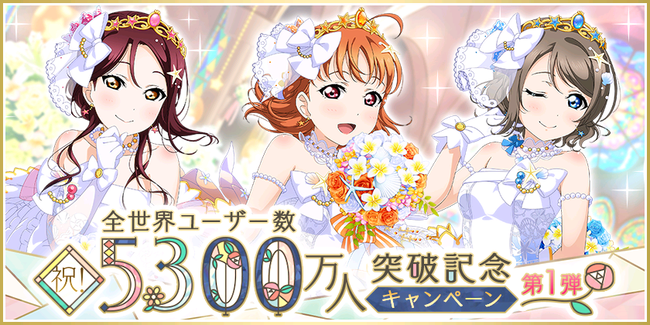 株式会社ブシロード(本社:東京都中野区、代表取締役社長:木谷高明)は、KLab株式会社(本社:東京都港区、代表取締役社長:森田英克)と共同開発いたしましたスマートフォン向けアプリ『ラブライブ!スクールアイドルフェスティバル』(以下、スクフェス) において祝!全世界ユーザー数5300万人突破記念キャンペーン第1弾の開催をお知らせいたします。