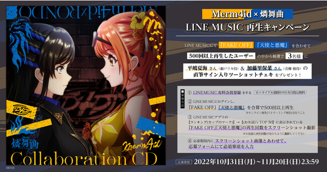 サブスク含む各音楽配信サービスにて、Merm4id×燐舞曲 Collaboration CD「FAKE OFF / 天使と悪魔」より、「FAKE OFF」「天使と悪魔」の先行配信が決定いたしました。