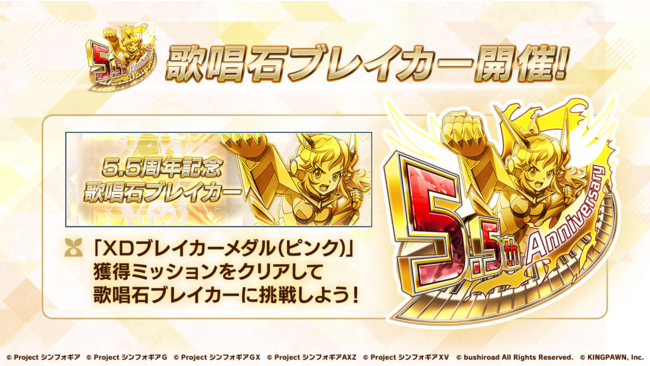 「5.5周年記念歌唱石ブレイカー」の挑戦に必要な「XDブレイカーメダル(ピンク)」は、「5.5周年記念ミッション」で獲得可能です。
