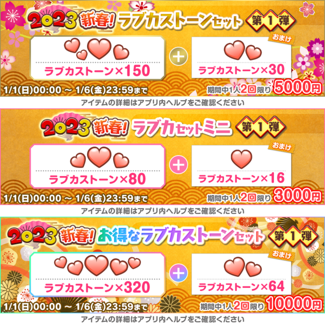 1日目:ラブカストーン ×50、2023お年玉勧誘チケット ×99