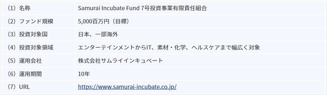 この投資戦略の考えのもと、当社は株式会社サムライインキュベート(本社:東京都港区、代表取締役:榊原 健太郎、以下「サムライインキュベート社」)が、組成したファンド「Samurai Incubate Fund 7号投資事業有限責任組合」(以下「本ファンド」)に出資したことをお知らせいたします。
