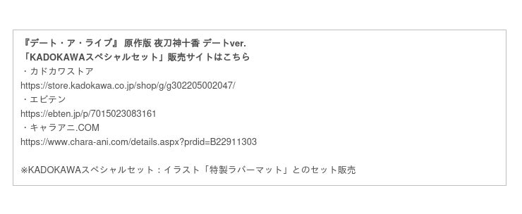 また、カドカワストア、エビテン、キャラアニ.comでは、フィギュアのモチーフとなったイラストをあしらった特製ラバーマットをセットした「KADOKAWAスペシャルセット」もご用意しております。