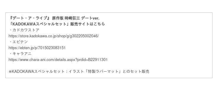 株式会社KADOKAWA(本社:東京都千代田区、代表取締役社長:夏野 剛 以下KADOKAWA)は、「“手に取れる”新しい物語」をコンセプトとしたフィギュアブランド「KDcolle(KADOKAWAコレクション)」の新作アイテムとして、『デート・ア・ライブ』 原作版 時崎狂三 デートver.1/7スケールフィギュアの予約受付を、カドカワストア、エビテン等で9月30日(金)より開始いたしました。本フィギュアの予約締切は11月16日(水)を予定しています。
