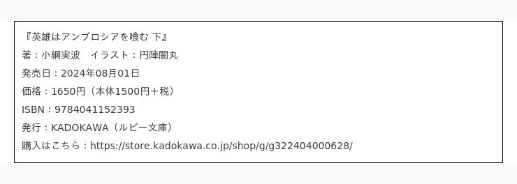 株式会社KADOKAWA(本社:東京都千代田区、取締役 代表執行役社長 CEO:夏野剛)は、ルビ―文庫発の本格ファンタジーBL小説単行本レーベル「Ruby collection」より、『英雄はアンブロシアを喰む 下』を8月1日(木)に発売いたします。また、同作品はB's-LOVEY COMICSでのコミカライズが決定したことを発表いたします。