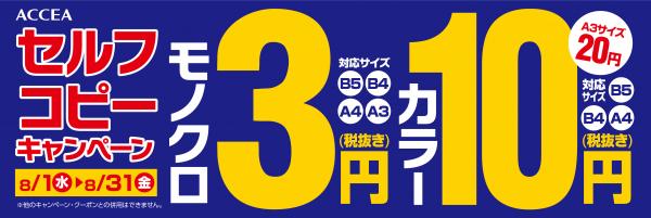 A4セルフカラーコピーが10円、モノクロは3円(税抜価格)になる『セルフコピーキャンペーン』を2018年8月1日(水)から8月31日(金)の1か月間実施することをお知らせいたします。