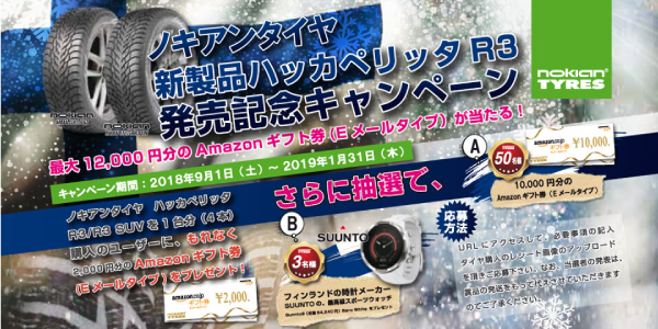 キャンペーン期間中(2018年9月1日〜2019年1月31日)にノキアンタイヤ ハッカペリッタR3/R3 SUVを1台分(4本)ご購入の方に、