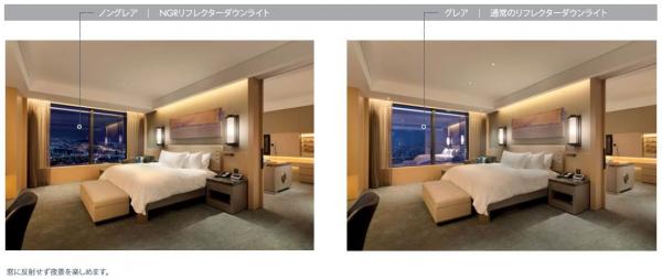 また、器具の存在を感じさせない遮光角、点灯感を抑制し、照明が空間に自然に溶け込むような演出が可能です。高級ホテル等において、夜景がより美しく見える状況を実現しています。