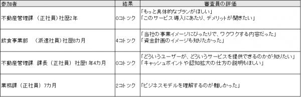 「独創性」「市場性」「実現性」「収益性」「将来性」「社会貢献性」の6つのポイントから審査し、3名から高い評価(3コトツク)を得た場合、後日、企画の内容は経営会議にかけられ、新規事業に採用するかどうか最終判断がされる。