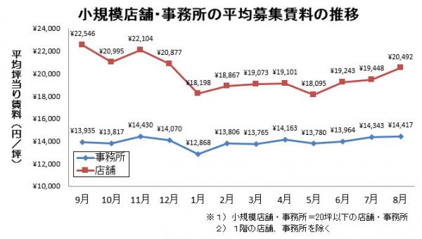 小規模店舗(20坪以下)の平均募集賃料は、前月から5.4%上昇しています。8月は、賃料高めの物件が募集に出ており、空室の平均募集賃料が上昇しました。