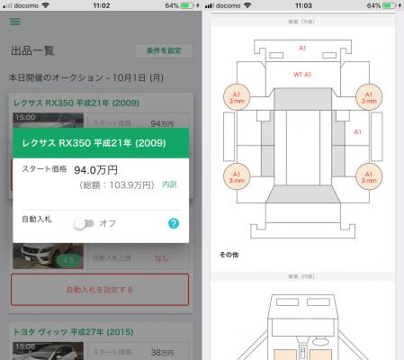 1画面の掲載車両数が増えました。また、車両ごとに「開催中」、「応札あり」、「ウリキリ達成」ボタンが点滅したり、ウリキリに達成すると応札ボタンが虹色に変わるなど、オークションの状況を視覚的に把握できるようになりました。