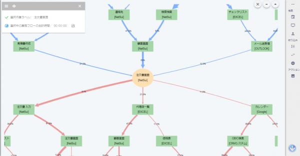 「操作分類」や「業務パターン」の集計と業務プロセスのフローを自動で抽出し、フローチャートで可視化することで、その分析結果を専用のWeb画面からいつでも確認することができます。